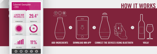 酿酒的过程(图片来自于The Miracle Machine.net) 我们将酿酒需要的葡萄、酵母、水放入到“酿酒神器”中,然后下载The Miracle Machine的APP到你的iPhone上,通过蓝牙与酿酒器连接,接下来你就可以在手机上来控制和了解你酿酒的过程了。 这款神器提供了酿造多种酒的模式,利用酿酒器中的各种传感器,我们可以直接将酿酒过程中的数据信息传输到手机上,从而帮你把控酿酒的过程。当酿造过程完成时,你的手机上就会接到完成的提醒,接下来就可以从酿酒神器中倒出你自酿的红酒进行品尝了。 目前这还是一个正在募集资金的项目,或许很快就将能够上市与我们见面。用手机控制酿酒你是否有兴趣尝试一下呢?