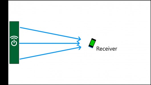 要是有人站在发射器和接收器之间了呢?这样直线地传输就不行了,但Cota系统有另外的办法,如下图所示,它会通过墙面的反射来传输电量。在有多个障碍物的情况下也是如此。另外,即便人接收到了微波,在这种低剂量的情况下,不会造成伤害,即便长时间也不会。