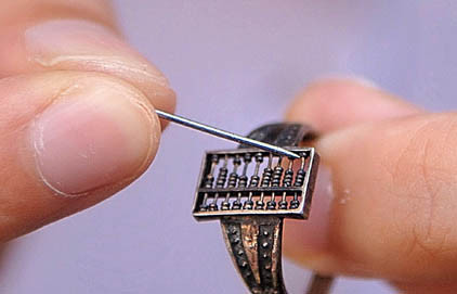 这款智能可穿戴设备如上图所示,一个中国独有的算盘镶在一个戒指上,算盘的长度有1.2厘米,而宽度仅有0.7厘米。尽管这个算盘比较小,但是它的计算能力和普通的算盘没有本质区别:和普通算盘一样,它一共有9档,是一个二五式珠算盘。