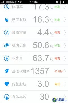 轻轻点击就可以了解每项指标所代表的意义 轻轻点击每个选项就会出来该项指标的相关介绍,比如上图中,轻点“骨骼重量”,就会出现一个对话框,显示出它的含义和标准。作者认为这不仅可以让我们更好地了解如何科学、健康的锻炼或减肥,还能让我们能够清清楚楚的明白我们这样做的原因和意义。比如通过上面的截图,作者了解到自己的重量、体脂率、皮下脂肪等都是合格的,而骨骼重量、水含量(那是因为我媳妇天天让我多喝水的原因)是超标的,而内脏脂肪偏低,基础代谢率偏高。这会督促我们在饮食、运动中变得更加有目的性,不是吗? 【感谢您阅读本文,请您点击文章下方黄色“赞”,以便让我们做的更好】 6 总结:为健康没有花钱的不是
