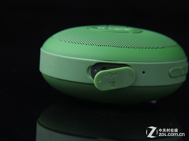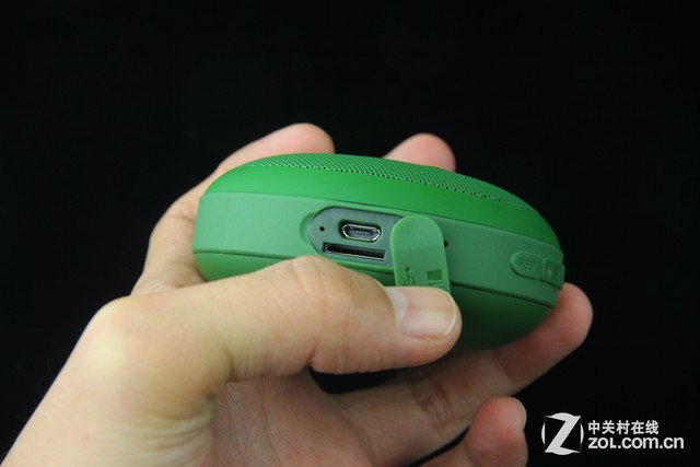 这款蓝牙音响的侧面加入了橡胶材质的控制按键,除了正常的上下曲调节和音量增加与开关之外,这款蓝牙音响还加入了一个非常特别的复位按键,可以在音响死机的时候或者按键无法操控的时候进行复位,保证了用户的操控感受。在控制按键的下方带有麦克风设计,麦克风的一侧带有一个带有胶塞的充电接口和TF卡读取口与指示灯,可以起到一定的防护效果,并且增强音响本身的整体感。