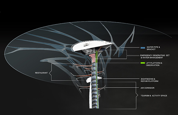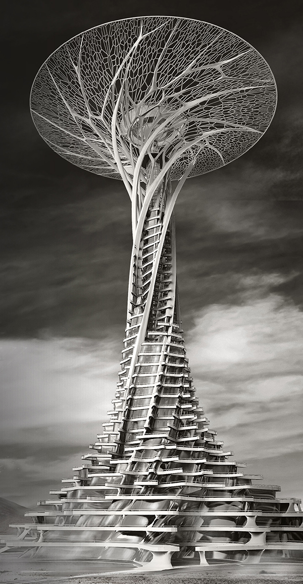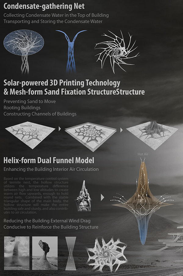 沙子巴别塔(Sand Babel)是一种专为沙漠地区设计的将科研和旅游功能融为一体的建筑结构,以太阳能为动力,完全用沙子 3D 打印。 这种概念建筑为地上、地下两部分,主要建材都是当地的沙子,通过太阳能 3D 打印机烧结、打印建造。建筑物采用仿生设计,地面以上造型为螺旋结构,像是沙漠里常见的龙卷风和蘑菇石,可满足居住、科研、旅游等需求。 地面以上的通道不仅可以改善通风状况,而且还可以利用昼夜温差收集水分。 地面以及地下的网状结构类似于大树的根,除了方便在各个建筑物之间的交通之外,还可以起到固沙的作用。 沙子巴别塔是 eVolo 杂志举办的 2014 摩天大楼设计大赛参赛作品。 设计师是来自中国的Qiu Song,Kang Pengfei,Bai Ying,Ren Nuoya,Guo Shen。 除非特别声明,本网站内容均为原创。转载请注明文章来自设计癖