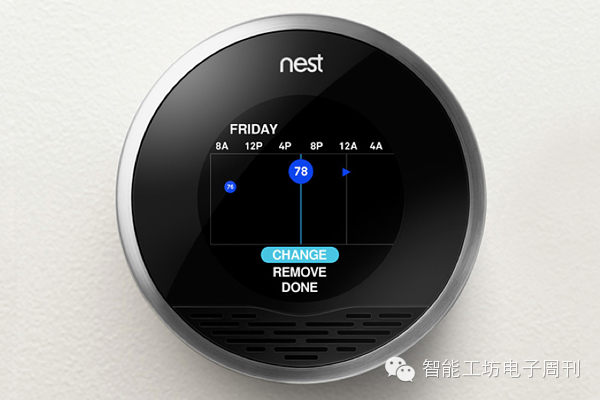 2011年美国Nest Labs推出的一款家庭恒温器,它可以通过记录用户的室内温度数据,智能识别用户习惯,并将室温调整到最舒适的状态。