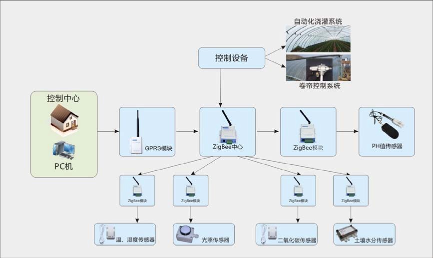 在温室环境里单个温室即可成为无线传感器网络一个测量控制区,采用不同的传感器节点和具有简单执行机构的节点(风机、低压电机、阀门等工作电流偏低的执行机构) 构成无线网络来测量土壤湿度、土壤成分、pH 值、降水量、温度、空气湿度和气压、光照强度、CO2浓度等来获得作物生长的最佳条件,同时将生物信息获取方法应用于无线传感器节点,为温室精准调控提供科学依据。最终使温室中传感器、执行机构标准化、数据化, 利用网关实现控制装置的网络化, 从而达到现场组网方便、增加作物产量、改善品质、调节生长周期、提高经济效益的目的。