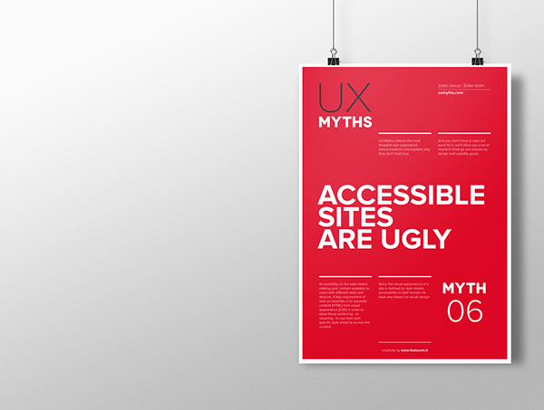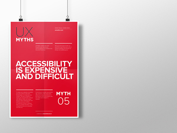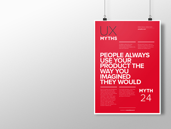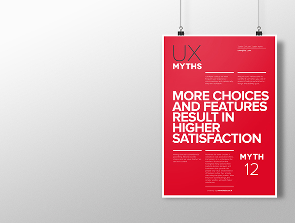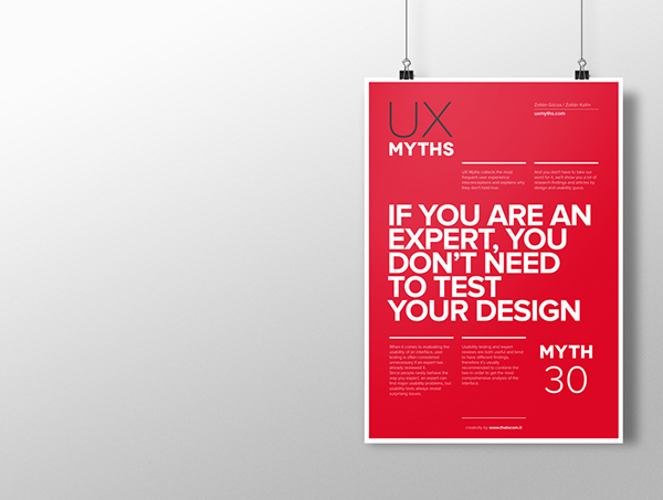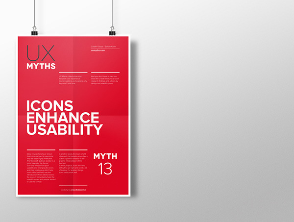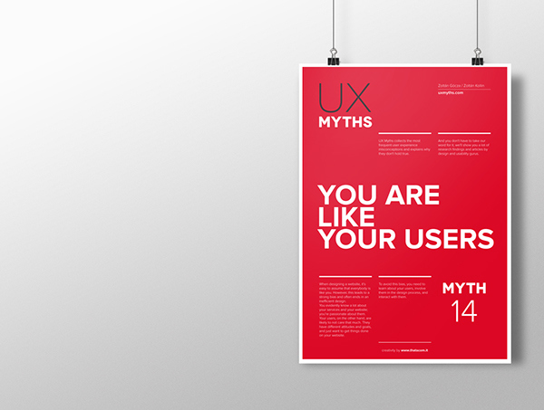 匈牙利的用户体验设计师ZoltánGócza列出了关于UX和网页设计32个神话,和破除迷信的论证观点。一个意大利的传播和广告机构That’s Com 非常喜欢这32个观点,于是请来自由平面设计师Alessandro Giammaria,把他们设计成了一组很赞的海报。