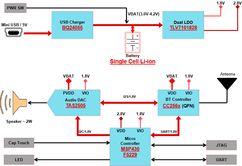 蓝牙和MSP430音频信宿参考设计 描述 TI 的蓝牙 + MSP430 音频散热器参考设计可供客户用于创建各种低端、低功耗音频解决方案的应用。一些可能的应用 - 玩具、低端蓝牙扬声器、音频播放配件。此参考设计是一种经济实惠的音频实施方案,通过参考其提供的完整设计文件,您可以将重心转移到应用和最终产品开发工 作上。此参考设计支持的软件包括 StoNestreet One Bluetopia 蓝牙堆栈(经过认证且免专利费)。 蓝牙和MSP430 音频信宿参考设计 特性 凭借最低成本、最低功耗的 MSP430F5229 实现蓝牙音频功能(SBC 编码/解码) 设计中将音频处理任务从 MCU 转移到蓝牙器件,从而实现低功耗音频 这种经济高效的低端无线音频解决方案,采用 4 层布局和 QFN 封装 此解决方案的内核是 TI 的 CC2564,此内核拥有一流蓝牙性能(+12dBm 输出功率) 设计中还采用了 TI 的低功耗数字输入扬声器放大器(TAS2505) 和 USB 充电管理器件 (BQ24055) CC256x 和 Bluetopia 堆栈均有蓝牙子系统 QDID,因此您可以只需要一份蓝牙最终产品列表 相关器件 1.BQ24055 具有自动 AC/USB 检测功能和PG的800mA单输入单节锂离子电池充电器