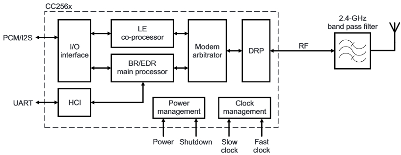 BQ24055 功能方框图 2.CC2560 蓝牙 Smart Ready 控制器,TICC256x器件是一款完整的蓝牙BR/EDR/LEHCI解决方案,此解决方案减轻了设计工作并可实现快速上市。基于TI的第七代蓝牙内 核,器件实现了已经证明的解决方案,此解决方案支持蓝牙4.0双模式(BR/EDR/LE)协议。TI的电源管理硬件和软件算法大大节省了所有广泛使用的 蓝牙BR/EDR/LE模式运行的能耗。 CC2560 功能方框图 应用:建筑照明、用于 HMI 和 POS 的单板计算机
