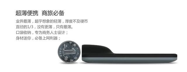 超薄便携,商旅必备。业界最薄,超乎想象的轻薄,厚度不及硬币直径的三分之一,没有更薄,只有最薄。口袋收纳,转为商务人士设计,身材迷你,必备上网利器。