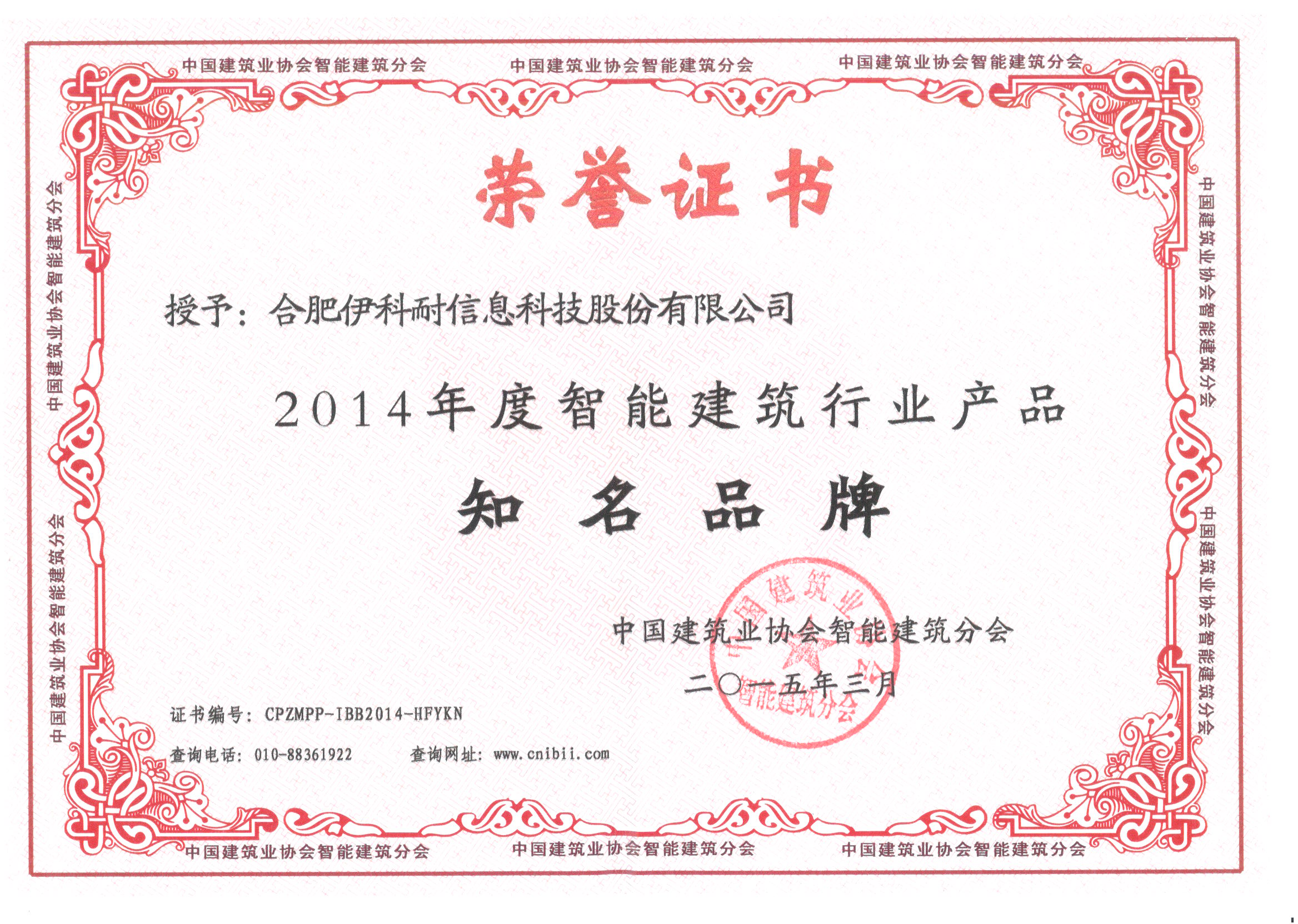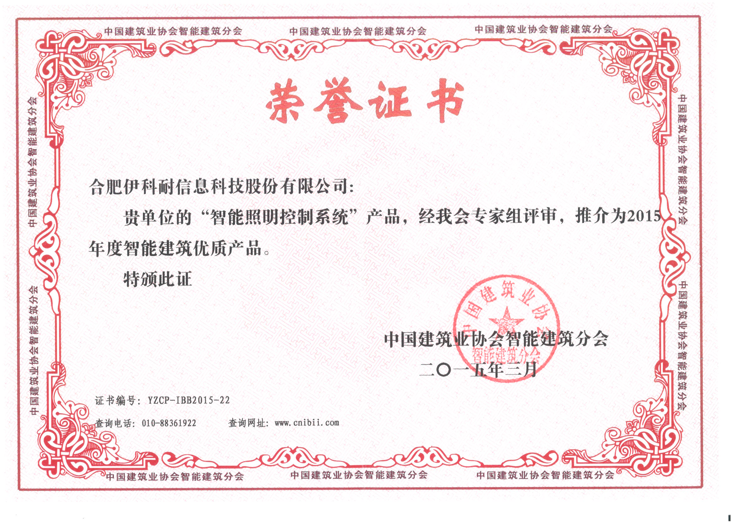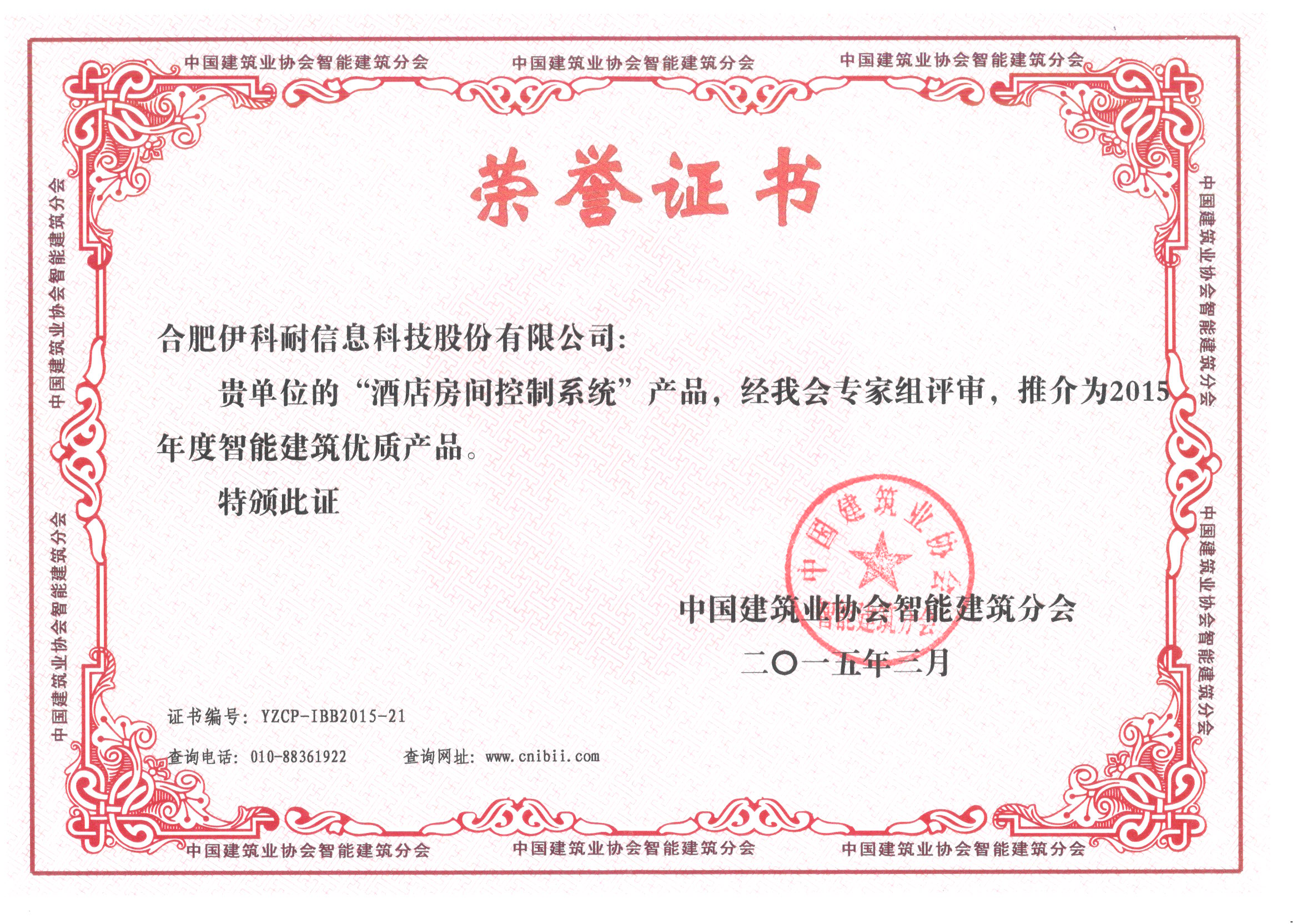 中国建筑业协会智能建筑分会 2014 年年会暨 2015 智能建筑行业发展高峰论坛于2015年3月18日-20日在合肥市政务区天鹅湖大酒店举办,我司为会议全程赞助奖品和礼品,众所期待,礼品丰厚!合肥天鹅湖大酒店亦为我司智能照明和客控项目之一,此次会议在天鹅湖大酒店举办,同时也为我司做了一次最精彩的项目案例展示。 19日颁奖庆典晚宴期间,我司荣膺四项大奖:推介我司“智能照明控制系统”产品为“2015年度智能建筑优质产品”、授予伊科耐为“2014年度智能建筑行业产品知名品牌”、推介我司“酒店房间控制系统”产品为“2015年度智能建筑优质产品”、授予我司员工吴亚玲同志为“2014年度全国智能建筑行业优秀信息联络专员”。 我们将紧跟行业最新发展方向,拥护协会的倡导和指示,共同推进行业健康发展,为智能建筑行业贡献我们的智慧和力量!