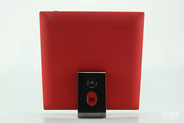 ▲背面为红色塑料保护壳,有一个扬声器孔、一个麦克风孔,还有一个micro USB充电孔