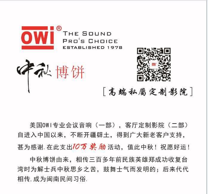 澳音携新品JL688惊艳上海智能建筑展 2015中国第九届上海国际智能建筑暨智能家居化展览会- [摘要] 2015中国第九届上海国际智能建筑暨智能家居化展览会将于2015年9.23-9.25在上海新国际博览中心举行,本次智能家居展邀请到国际知名厂商南京物联,OWI澳音(美国),河东电子,等知名厂商。同期美国OWI澳音倾情 10万 举办独居闽南风情“博饼”活动,回馈新老客户,精彩连连,值得期待!