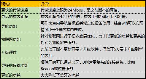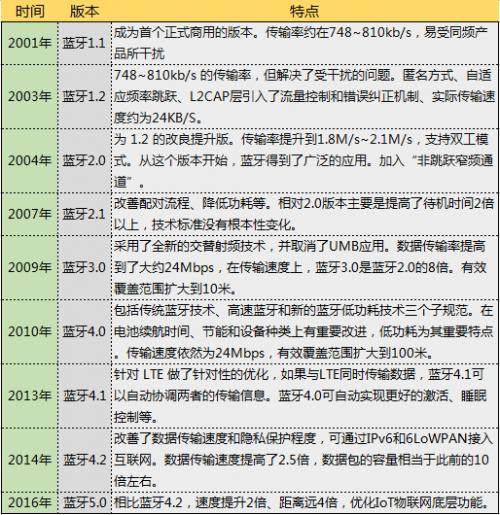 不到20年时间的发展,蓝牙5.0到来了。蓝牙5.0的多位前辈中以1.1、1.2、2.0、2.1、3.0、4.0、4.1和4.2为主,用一张表格对蓝牙版本及技术特点进行概括介绍:
