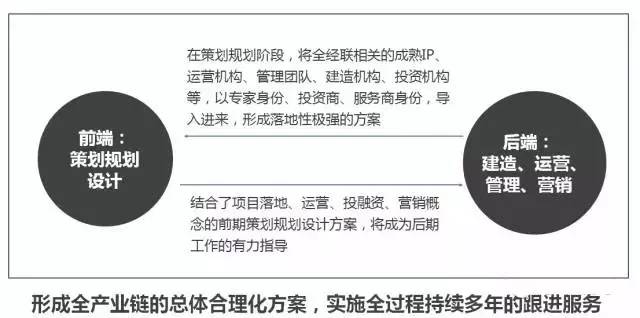 绿维创景以产业链整合为模式,有效利用各种资源,突破原有的项目推进和开发时序,将后期导入前期,在进行策划规划设计的同时,引入后期的建造、成熟项目、营销、管理、服务、投融资等资源,使得策划规划过程也成为一个推动项目落地的过程。