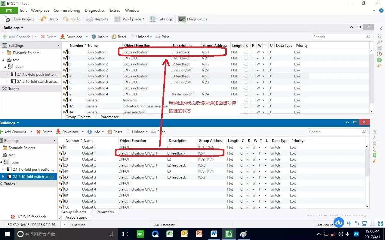 然后,我们需要用驱动器输出的状态反馈来通知按键的状态,也就是把这两个对应的对象,放到一个组地址里。具体就是分别建立3个有关状态反馈的组地址,比如说是1/2/1,1/2/2,1/2/3,然后把3个回路的输出状态反馈和按键的状态接收分别分组。