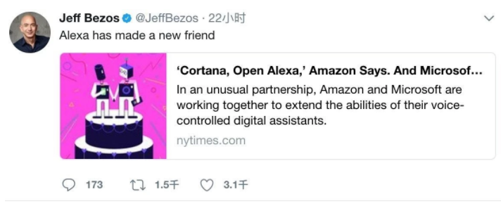 近日,亚马逊首席执行官杰夫·贝索斯发了条言简意赅的推特:“ Alexa 交了个新朋友。” 这个新朋友正是微软的小娜 Cortana,Alexa 和 Cortana 分别是亚马逊和微软研发的语音助手。 来源:Twitter 8月30日,微软和亚马逊共同发布了“史无前例”的对外声明,它们将在人工智能语音助手方面联手合作。 对于关注人工智能和虚拟助手领域的人来说,这是一个重大的时刻。不久,这些虚拟来客就能在人们的家中“一展身手” —— 它们不仅能和你交流自如,现在还能和它的小伙伴互相“唠嗑”了。 几年前这些场景还只是科幻电影的情节,但是如果这两家公司的“友谊之树”结出硕果,那么这场“科幻电影”有望于年内成为现实,走进普通消费者的日常生活。 一个伟大的想法?微软和亚马逊此次合作,可以充分发挥各自在 AI 领域的优势,从而取长补短。微软称 Cortana 每月有 1.45 亿活跃用户,而装有 Alexa 的 Amazon Echo(智能家居控制装置)目前在智能语音市场上一家独大。 Alexa 是你逛亚马逊网站的得力助手,同时它也被看做是智能家居的守门人。从控制智能锁、冰箱,到调节室内灯光,没有 Alexa 无法交互的智能家具。 而微软旗下的 Cortana 是理想的办公助手:它被预装进 Office 365 中,可以访问你的日历、文档和表格文件。在不远的将来,微软表示它将和领英合作,开发出新功能 —— 通知人们下场会议的参会人员。 那么这两个本来就很厉害“小妖精”一旦合作,会为我们的生活带来哪些奇妙的改变呢? 首先,你可以使用 Amazon Echo(或者其他内置有 Alexa 的设备)与 Cortana 对话;也可以使用 Windows 10 PC(或者安装有 Cortana App 的手机)和 Alexa 聊天。 然后你只需说一句:“ Alexa,打开 Cortana”,或者“ Cortana,打开 Alexa”。就像念了一句咒语,接着你的设备就将自己的控制权交接给了对应的虚拟助手了。但是据《纽约时报》报道,这项技术并不完美,仍然存在很大局限 —— 两个语音助手在运行过程中,会近乎完全地隔离彼此。 比如,你正在 Amazon Echo Dot 上使用 Cortana,但是你想登陆 Amazon Prime 的账号听音乐,这种情况下,你必须切换回 Alexa 才可以。 微软 CEO Satya Nadella 正在谈论适用于安卓系统的 Cortana App 来源:REUTERS/Jim Young 这种策略正是亚马逊和微软所喜闻乐见的:一方面,亚马逊不想让微软访问自己用户的消费行为数据;另一方面,微软也不愿意让亚马逊直接获取自己的数据。 但是站在用户的角度,这种设计有点招人厌。可以想象一下 —— 每次打开电视需要用专门的程序,调暗灯光又需要用另外的程序,这样就需要你不停地切换虚拟助手,你说麻不麻烦? 这两家公司也意识到了这个问题,亚马逊首席执行官杰夫·贝索斯在接受《纽约时报》采访时说,Alexa(或者 Cortana)的目标是自动识别用户的问题,并将它们精准推送给合适的语音助手处理。如此一来,用户就不用纠结于频繁的切换程序了。 不难看出,亚马逊和微软此次合作的思路很清晰,那就是要将 Alexa 打造成用户的生活助手,Cortana 则成为用户的工作助手。如果此番设想成真,那么整个行业就更有“看头”了。 前路漫漫实现人工智能设备之间的互通是一个伟大的构想,在接下来的几个月或几年内,这两大巨头可能会大肆宣传这次“史无前例”的合作。当然,它们如此兴奋的原因也不难理解。 LG 在2017年国际消费类电子产品展览会发布了新型智能冰箱(内置有亚马逊的 Alexa) 来源:David Becker/Getty Images