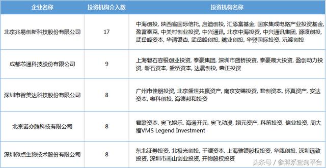 从最受投资机构喜爱的企业上看,北京兆易创新科技股份有限公司共获得17家投资机构参投,包括中海创投。启迪创投,中兴通讯,中关村等。