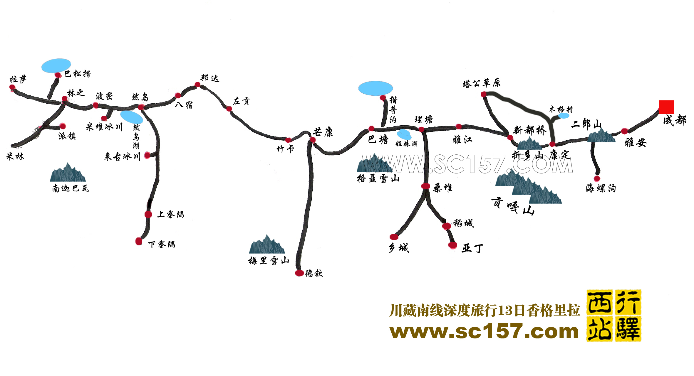 描绘本人所走川藏南线的线路图和沿途景点,分城镇、山川、河流等。照片为春季拍摄。