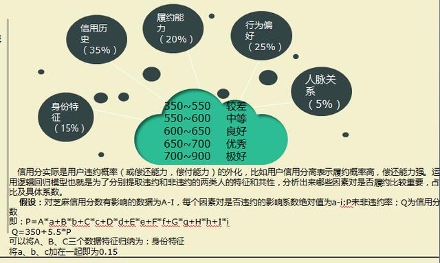 得出信用分:通过线性变换可以将预测概率 P 转化为 350 至 900 的用户得分 Q,Q=X+Y×P。输入一个新用户的50个数据指标,从而得出对应的预测概率P,从而得出信用分Q