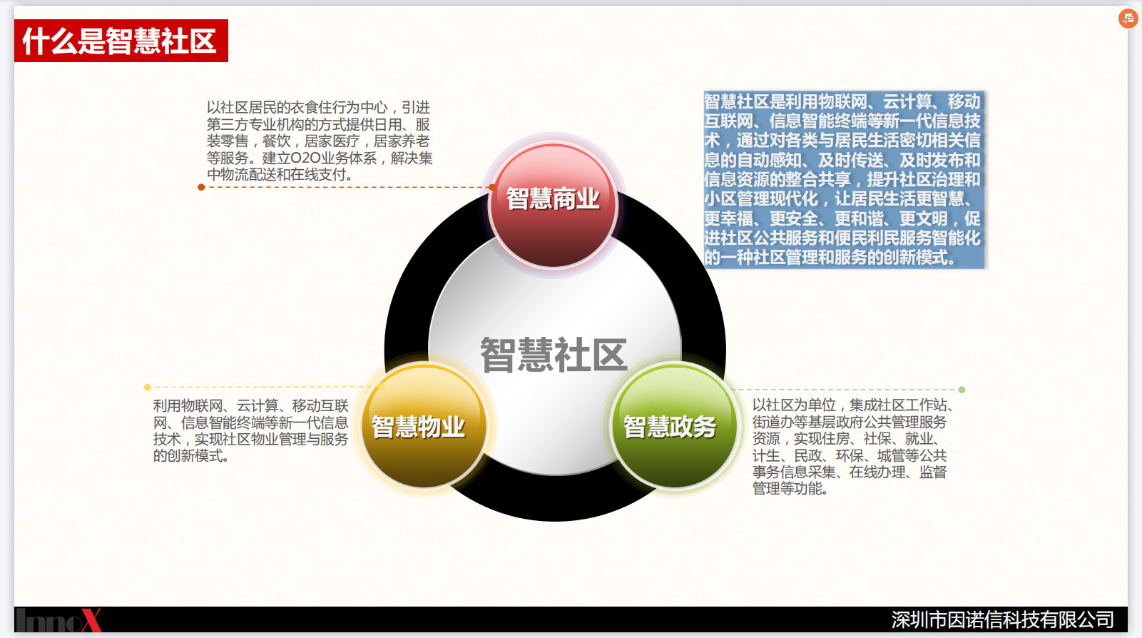 智慧社区是利用物联网、云计算、移动互联网、信息智能终端等新一代信息技术,通过对各类与居民生活密切相关信息的自动感知、及时传送、及时发布和信息资源的整合共享,提升社区治理和小区管理现代化,让居民生活更智慧、更幸福、更安全、更和谐、更文明,促进社区公共服务和便民利民服务智能化的一种社区管理和服务的创新模.