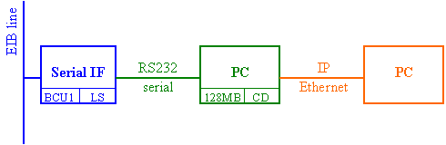 • A serial interface to the EIB. You may use any commercial RS232 interface, eg. BJE 6123, 6133, 6186/20. For freaks: it consists of a BCU1 with PEI16 interface and a level shifter to RS232 signaling.